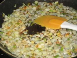Начнем с приготовления начинки. Лук порежьте кубиками и обжарьте в масле.