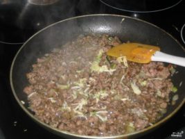 Добавьте затем фарш, перемешайте и обжарьте минут 5. Затем добавьте чеснок мелко порезанный, специи (соль, перец, орегано). Тушите все вместе еще пару минут.