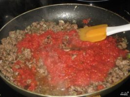 Помидоры в собственном соку порежьте на мелкие кусочки, сняв предварительно кожицу. Лучше вообще пюрировать их в блендере. Добавьте к фаршу. Перемешайте и тушите еще минут 7-10.