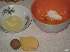 Теперь лазанью надо залить. Смешайте яйцо с майонезом, добавьте немного масла сливочного топленого и тертый сыр. Полученной смесью равномерно залейте лазанью.