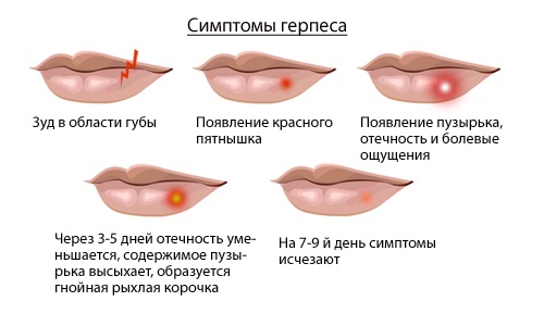 На губах появляются высыпания в виде пузырьков, которые увеличиваются в размерах и вызывают зуд и жжение.
