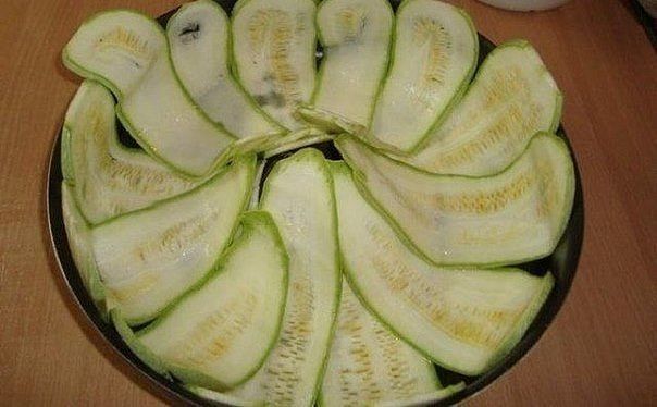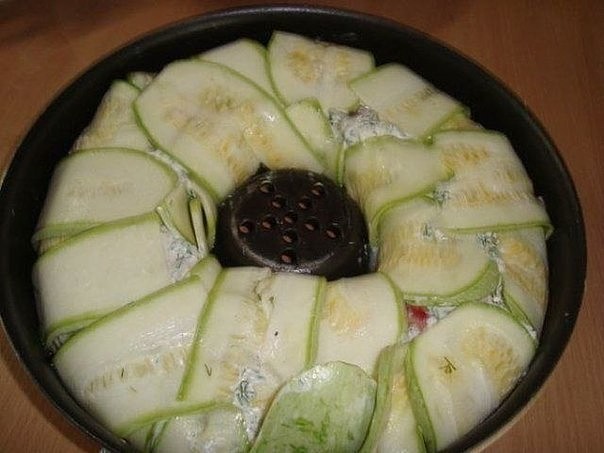 Форму для кекса смазать растительным маслом, уложить кабачки, так чтобы края кабачков свисали.
