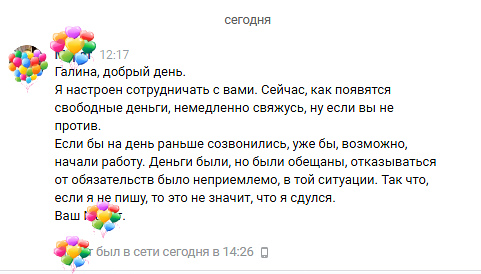 Мне написал клиент, с которым я как-то не очень давно разговаривала, но он пропал и я решила, что он из той же серии, что и все предыдущие, и как только услышал, что за мою работу надо платить, сразу и сдулся)