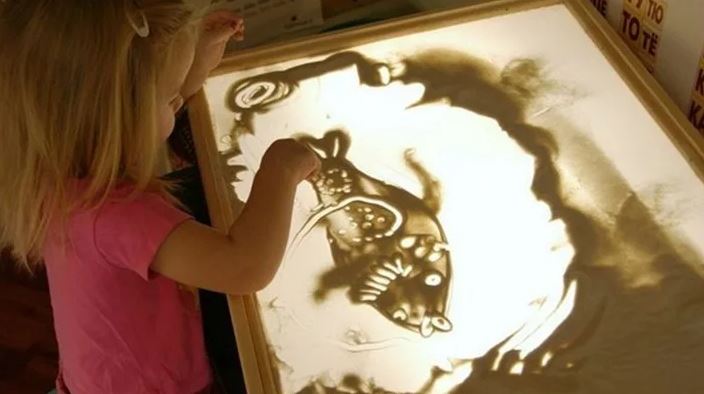 Во время занятий дети рисуют пальчиками на песке – но не в песочнице, а на специальном стекле, которое подсвечивается снизу. В результате возникают причудливые шедевры.