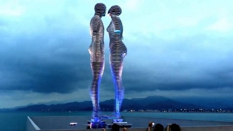 Семиметровые скульптуры примечательны тем, что каждый вечер фигуры Али и Нино медленно двигаются навстречу друг другу, меняя положение каждые десять минут. До тех пор, пока не встретятся и не сольются в одно целое. После этого начинается обратный процесс, а затем все по новой. Памятник эффектно подсвечивается.
