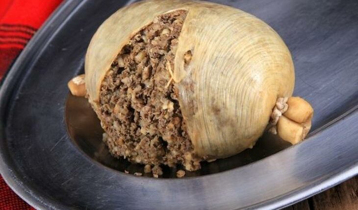 Хаггис – это блюдо из бараньих потрохов (сердца, печени и лёгких), смешанных с говядиной, овсянкой и рубленым луком и приправленных кайенским перцем и другими специями.