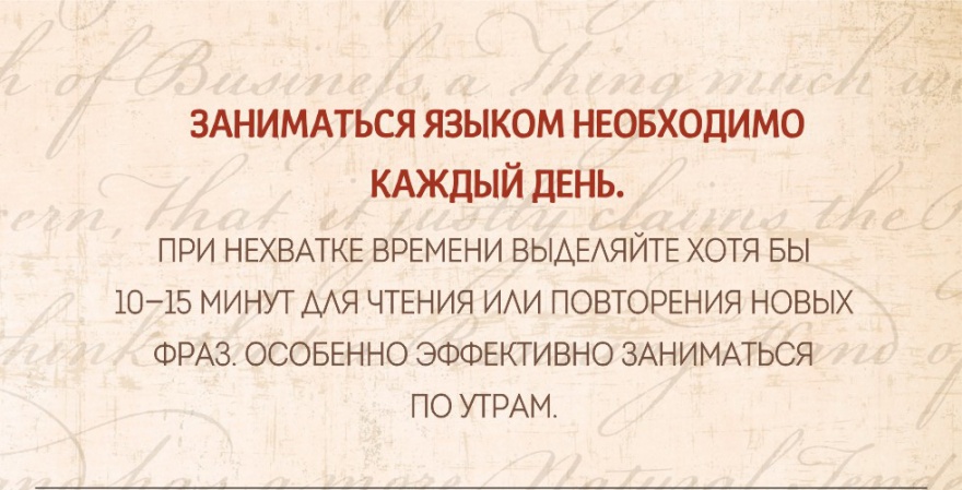 1) Занимайся языком ежедневно. Если уж совсем нет времени, то хотя бы десять минут. Особенно хорошо заниматься по утрам.