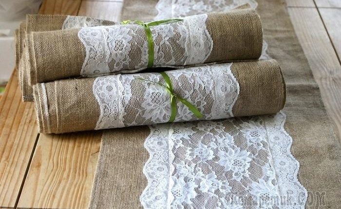 Обработав края мешковины лентами или гипюровыми тисемками, можно добиться поразительного эффекта. Такая скатерть будет смотреться нарядно и эксклюзивно, а еще она очень прочная и неприхотливая в уходе.