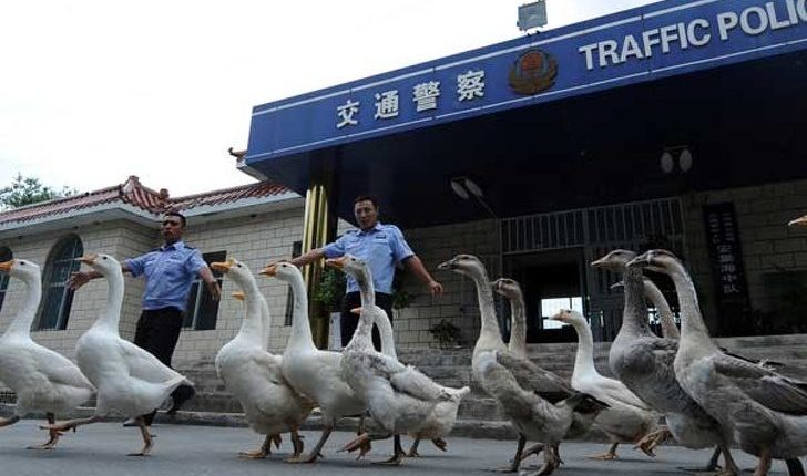 Полиция в сельских районах китайской провинции Синьцзян вместо собак берет на службу гусей. Обученные птицы охраняют полицейские участки. Слух и зрение у них не хуже, чем у собак, а их агрессивность и ярко выраженный инстинкт защиты территории позволяют гусям быть более ярыми охранниками, чем собаки. Также в китайской армии есть голубиные войска численностью более 10 000 почтовых голубей. Эта птичья армия дает преимущество китайцам, если высокие технологии выйдут из строя.