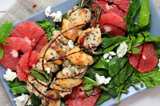 Нарезать филе кусочками и замариновать на ночь. Нанизать на шпажки и жарить на сковороде или в духовке. На тарелку выложить шпинат, апельсины, шашлычок, посыпать брынзой.