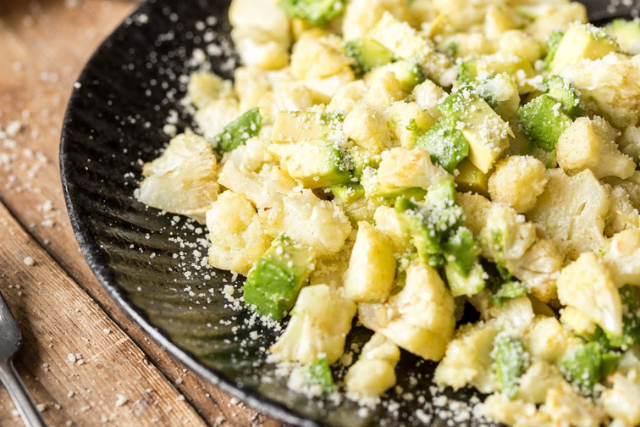 Сырую цветную капусту мелко нарубить ножом или блендером. Соединить капусту с тертым сыром и заправить натуральным йогуртом, смешанным с рубленым чесноком, орехами и зеленью.