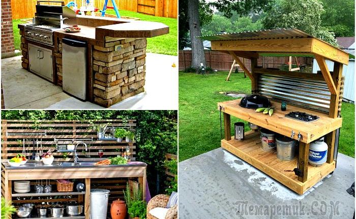 Маленькая летняя кухонька, которую можно сколотить своими руками из деревянных досок. На такой мини-кухне найдется место для подвесной системы хранения, мойки, рабочей поверхности и полок для посуды.