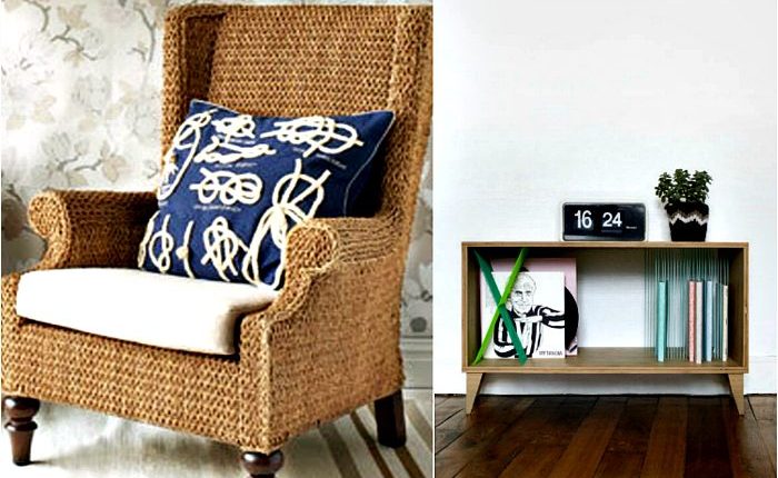 Практически любой предмет мебели можно украсить с помощью канатов. Кофейный столик и кресло, декорированные канатами или веревками добавят уюта интерьеру квартиры.
