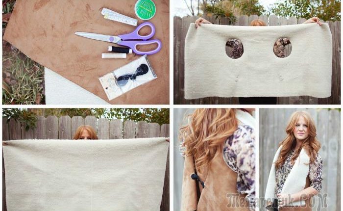 Все что нужно для создания этого стильного жилета — это прямоугольный кусок дубляжа и фурнитура. С помощью ножниц, сделайте аккуратные разрезы для рук, сзади пришейте купленную фурнитуру и наслаждайтесь уютной и уникальной вещицей, сделанной собственными руками.