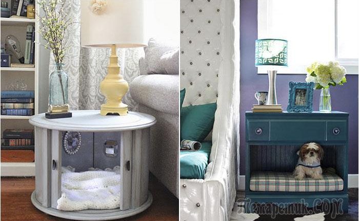 В этом случае приходится жертвовать интерьером, поскольку не всегда спальное место гармонично в него вписывается. Предлагаем объединить кровать для питомца и приставной столик для хозяев.