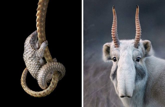 Слева: белобрюхий панголин, Западная и Центральная Африка. Справа: сайгак, степные зоны Казахстана, Узбекистана, России и Монголии. В 2002 году был отнесен к категории CR, то есть «находящийся в критическом состоянии»