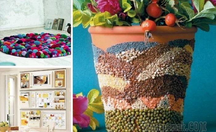 Наверняка у каждого в доме стоит пару обыкновенных скучных горшков с цветами. Добавьте красок и сделайте дизайн горшка из мозаики с помощью круп. Дешево, крупы всегда под рукой, но главное необычно и стильно.