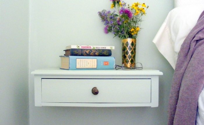 Обычный ящик от старого стола, покрашенный в подходящий к интерьеру цвет, сможет стать оригинальной прикроватной тумбочкой. Необходимо лишь закрыть его доской подходящего размера.