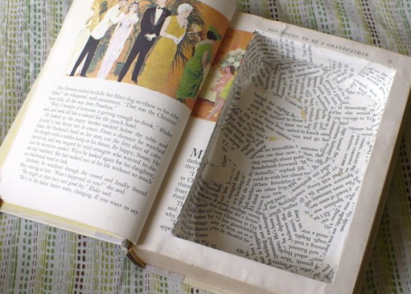 Из старой книги получится сделать креативное обрамление для картины или другого декоративного элемента. Просто вырежьте в книге отверстие подходящего размера, оставив нетронутой часть последних страниц и заднюю обложку. Затем наклейте на дно отверстия выбранный декоративный элемент. Чтобы книга не открывалась, промажьте ее страницы сбоку клеем.