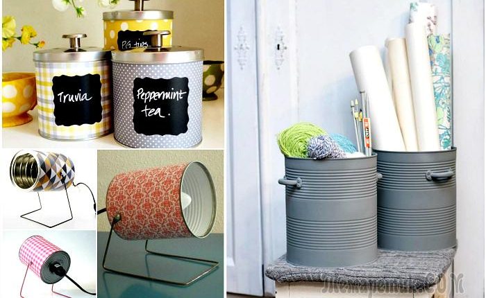 Путем несложных манипуляций жестяные банки больших размеров можно превратить в удобный контейнер для хранения остатков обоев в рулонах и пряжи.