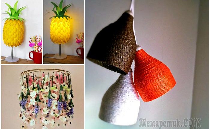 Стильные плафоны для создания которых потребуется лишь яркая пряжа, пластиковая бутылка, клей, патрон с проводом для люстры и лампочки.