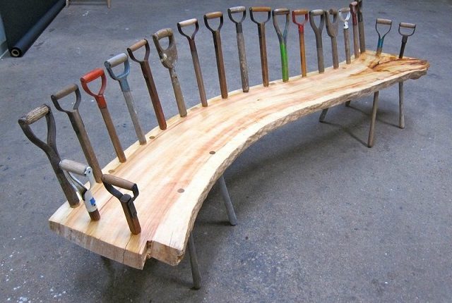 Скамейка из натурального массива древесины и старых черенков от лопат.