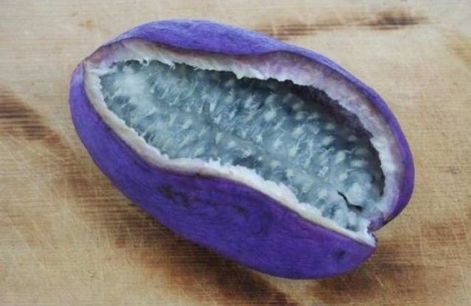 Очень красивый фрукт, который растет на севере Японии, в Центральном Китае и Корее. Его еще называют «лазающим огурцом». У него белая мякоть, наполненная внутри множеством блестящих черных семян, которую употребляют как фрукт. В то же время фиолетовый стручок едят как овощ.