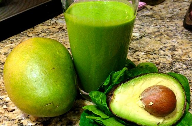 Половина грейпфрута, 15 клубник, горсть винограда без косточек, половина авокадо, 1 банан, сок половины лимона или лайма. Сначала измельчи в блендере льняные семечки, потом добавь всё остальное.