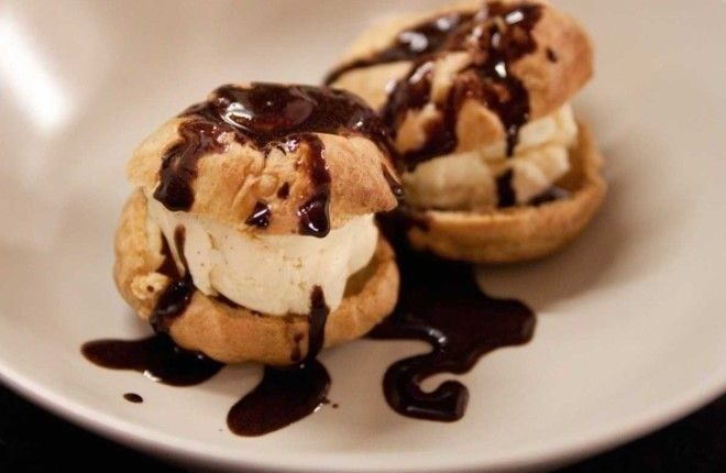 8. «Профитроли» — десерт из слоеного теста, наполненный ванильным мороженым и покрытый шоколадным соусом.