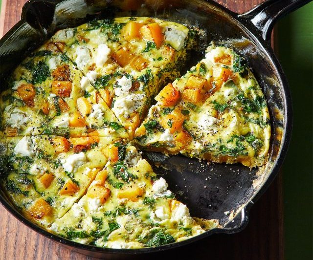Взбейте яйца, шалфей, соль и перец в большой миске. Залейте яичной смесью тыкву и капусту на сковороде, равномерно посыпьте сыром. Выпекайте 8-12 минут под закрытой крышкой, пока блюдо не застынет.