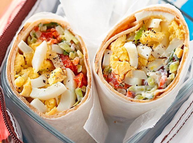 Распределите смесь брокколи по центру лепешки, сверху выложите яичные ломтики. При желании можете посыпать молотым перцем. Сложите лепешку по бокам поверх начинки, затем подогните нижнюю часть.