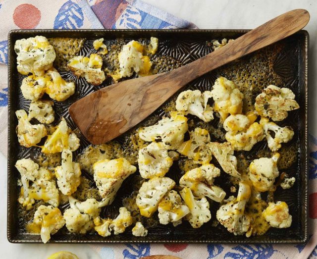 Разогрейте духовку до 180 градусов. Смешайте цветную капусту, масло, зелень, соль и перец в большой миске, переложите на большой противень с бортиками.