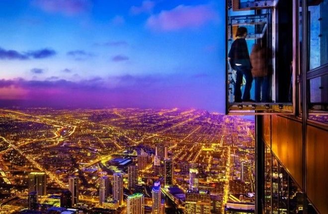 В самом сердце Чикаго на 103-м этаже Уиллис-тауэр расположилась смотрительная площадка. Вид отсюда открывается потрясающий, но рискнуть встать на стеклянный пол решаются далеко не все.