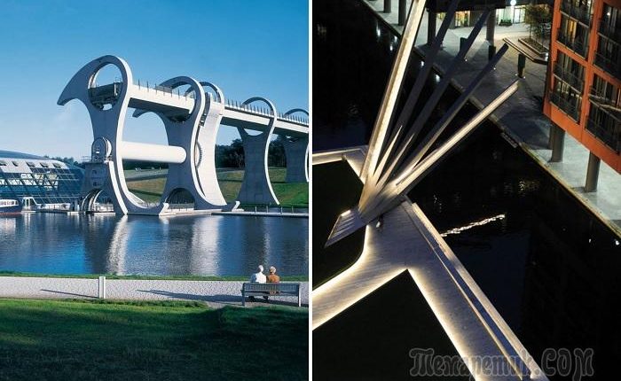 Фолкеркское колесо завораживает футуристической конструкцией – это единственный в мире мост-лифт для прохода судов между каналами, находящимися на разной высоте. Сооружение состоит из вращающихся вокруг своей оси двух лопастей, соединенных попарно с прикрепленными между ними двумя платформами. В высшей и низшей точке площадки стыкуются с берегами каналов Форт-Клайд и Юнион. Судно заплывает в емкость с водой на платформе и колесо совершает полуоборот, доставляя лодку в другой канал.