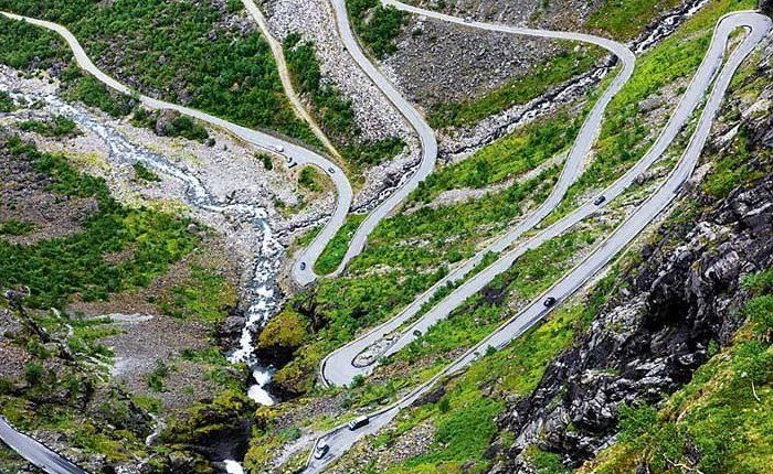 Лестница Троллей – это знаменитый туристический маршрут, расположенный в Норвегии. Строительство этого необычного пути было закончено в 1936 году. Представляет собой серпантин из причудливо изгибающихся по горному склону дорог, между которыми течет водопад длиной в 180 метров. Угол наклона Лестницы троллей – 9%.