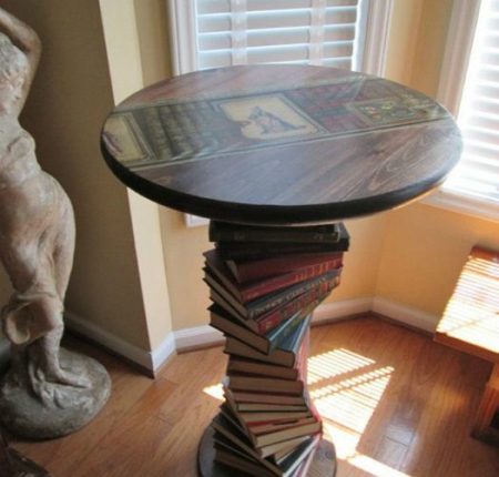 Стопку ненужных книг и два деревянных круга можно превратить в потрясающий стол, который станет практичным и уникальным украшением любого дома.