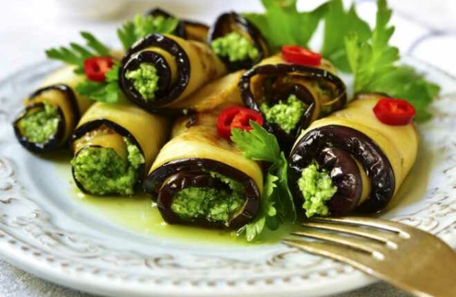 Готовую массу из приправ и орехов перемешайте с подготовленными баклажанами, и блюдо будет считаться готовым.