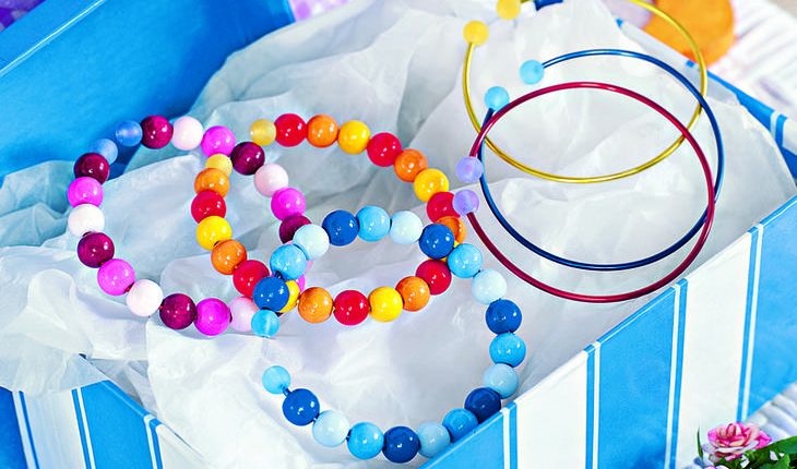 Деревянные бусины желаемого цвета, чередуя цвета, нанизать на алюминиевую проволоку. В завершение на концы накрутить маленькие бусины подходящего цвета, имитирующие цветное стекло. Для большей прочности в отверстия капнуть немного гелевого клея.