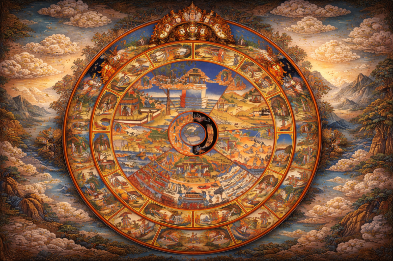 Сансара — это повторяющийся цикл жизненных ситуаций, реакций и привычек. Пока человек действует автоматически, эти сценарии продолжают воспроизводиться.