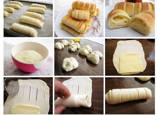 Каждый кусочек раскатала тонко (2-3 мм толщ.) в прямоугольник (раскатывать нужно на смазанном растительным маслом столе), на один край положила сыр