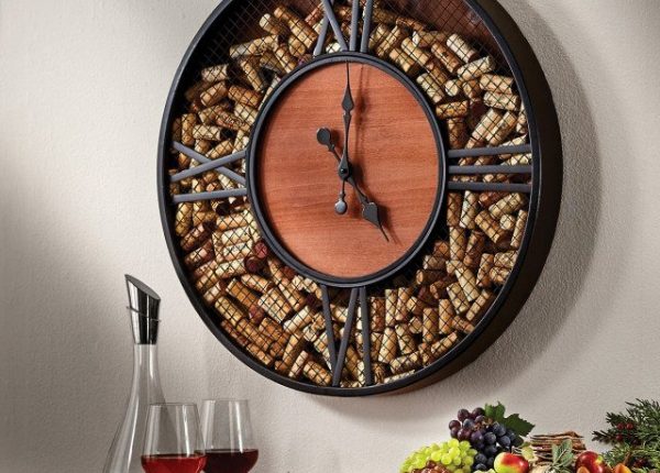 Часы из кованого металла и дерева ручной работы вешаются на стену и превращаются в элемент декора, в котором можно хранить сотни винных пробок за сетчатой рамой.