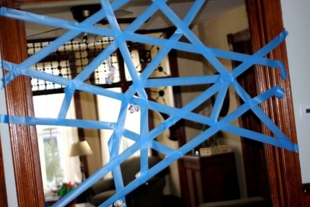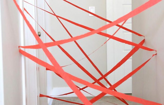 Чтобы создать «лазерный» лабиринт, понадобится цветная пряжа и что-то, чем можно ее закрепить на стенах: двусторонний скотч, горячий клей и проч.