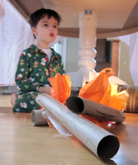 Сделайте «костер» из оранжевого целлофанового пакета, в качестве бревен могут быть бумажные рулоны. Поставьте палатку в комнате или сделайте хижины из одеял. Заваривайте чай, усаживайтесь поудобнее и играйте в странников в диком ночном лесу. Можете рассказывать друг-другу истории или охотиться на воображаемых зверей.