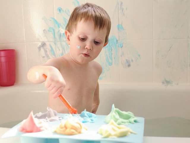 Процесс купания можно сделать гораздо интереснее, если дать ребенку цветные воздушные «облачка». Для их создания используйте пену для бриться и пищевой краситель.