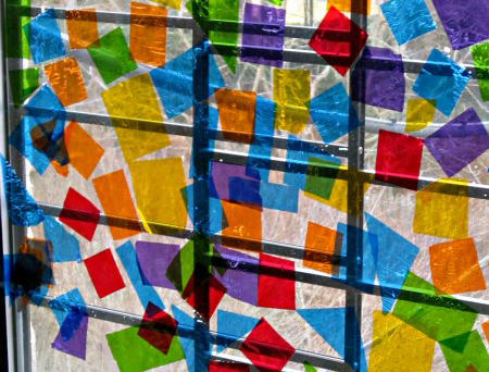 Возьмите несколько цветных целлофановых пакетов и вырежьте из них форму: круги, квадраты, звезды, сердечки. Чтобы закрепить их на окнах, используйте мыльный раствор.