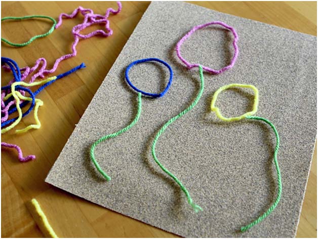 Возьмите несколько мотков разноцветных шерстяных ниток и нарежьте на полоски. Дайте детям кусок наждачной бумаги и кусочки ниток: пусть создадут произведение искусства. Они могут выкладывать из ниток буквы, узоры или рисунки.