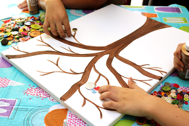 Возьмите лист А3 и нарисуйте голое дерево. Найдите ненужные пуговицы, дайте их детям вместе с клеем: пусть создадут из пуговиц листву.