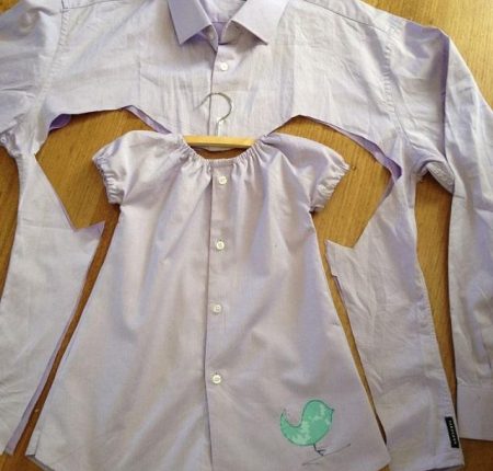 Если ваша рубашка запачкалась, и вы не можете больше ее носить, то не стоит ее выбрасывать, так как из нее можно сделать красивое платье для вашей дочки.
