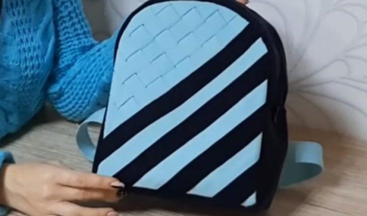 На второй части рюкзака можно сделать красивое плетение из джинсовых лент. Для этого просто продевайте горизонтальные полоски ткани сначала под вертикальными, а затем над вертикальными полосами. Хорошо закрепите полосы на подкладочной ткани.