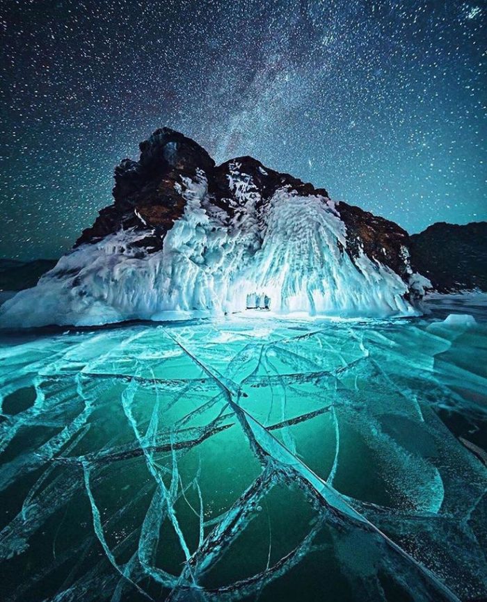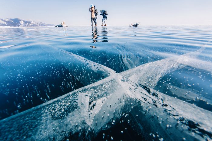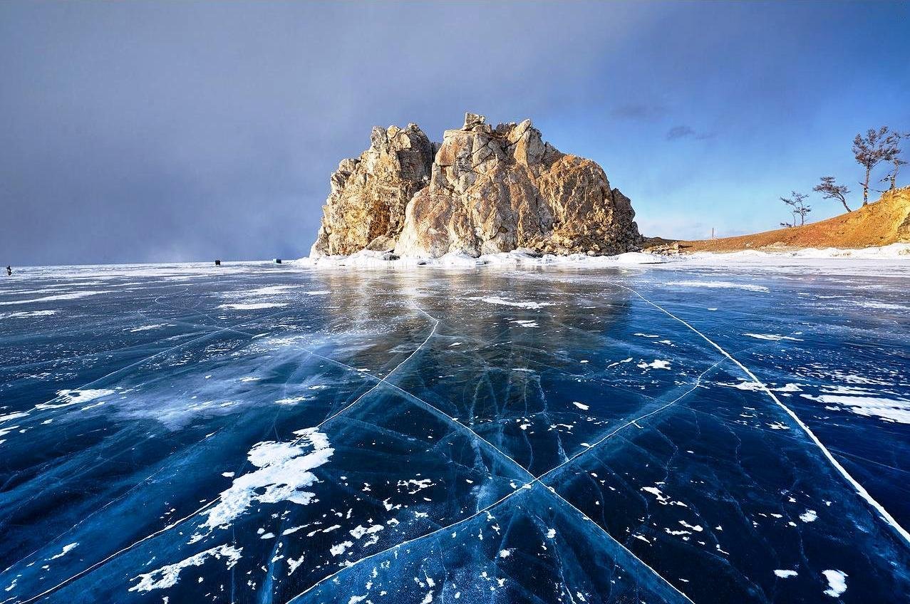 Байкал известен своим невероятным прозрачным льдом, когда озеро замерзает и может достигать от 70 см до 2 метров в толщину.